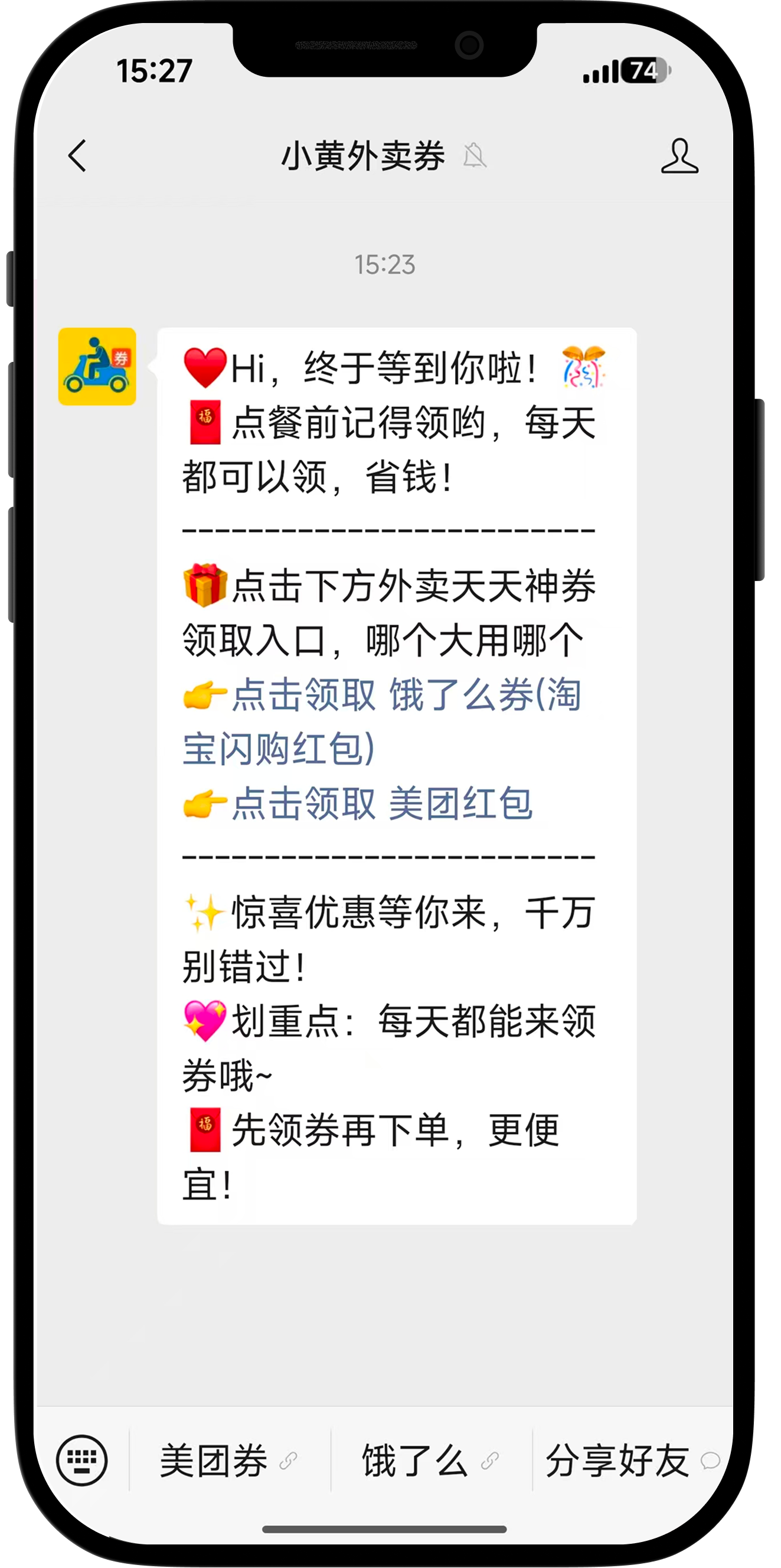 关注“小黄外卖券"微信公众号,回复“外卖红包"可获得美团外卖天天领入口,领取多个外卖红包优惠券