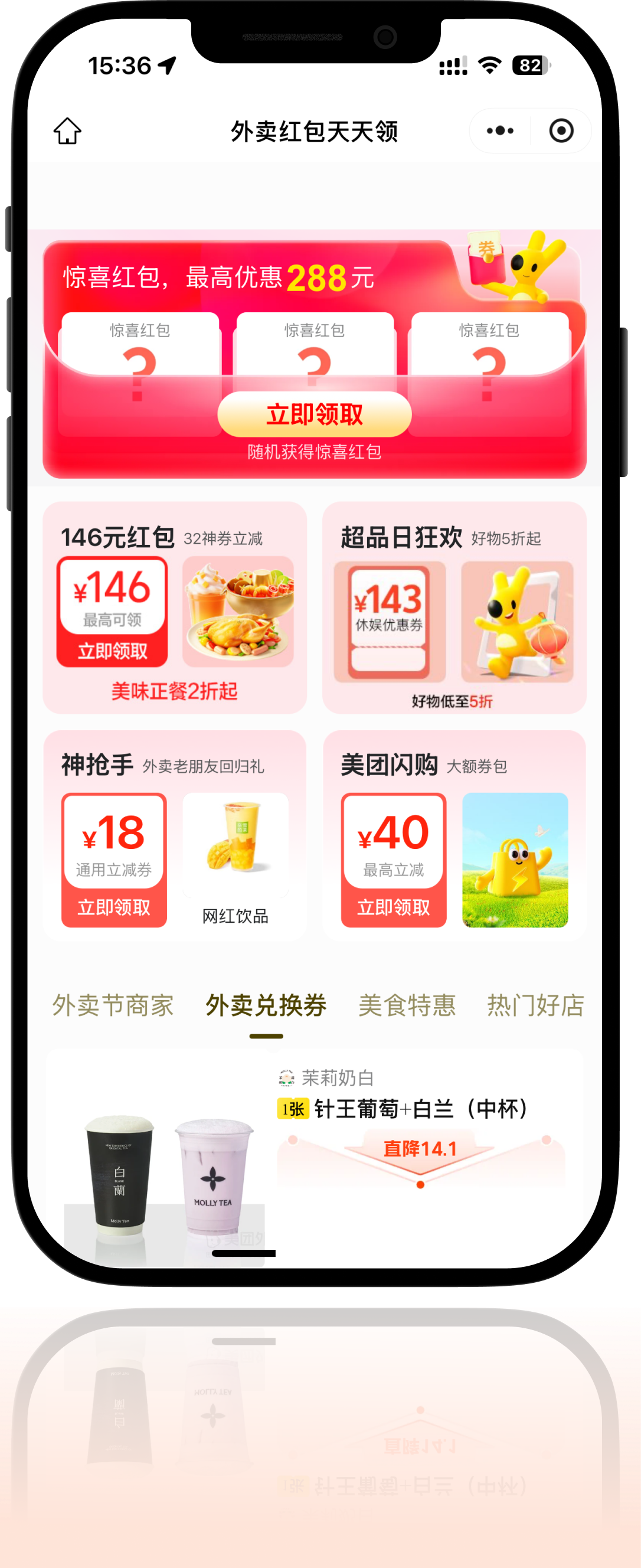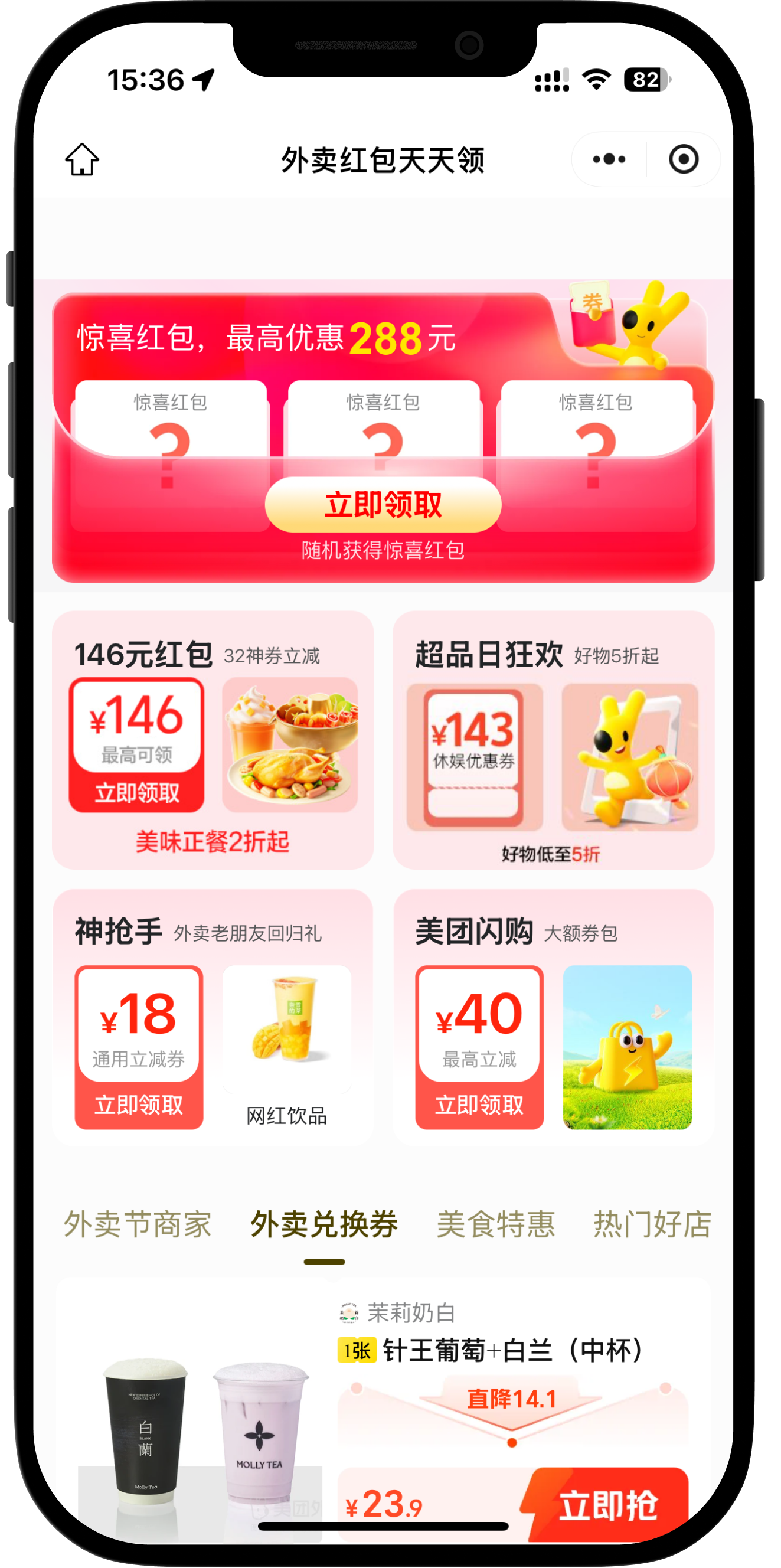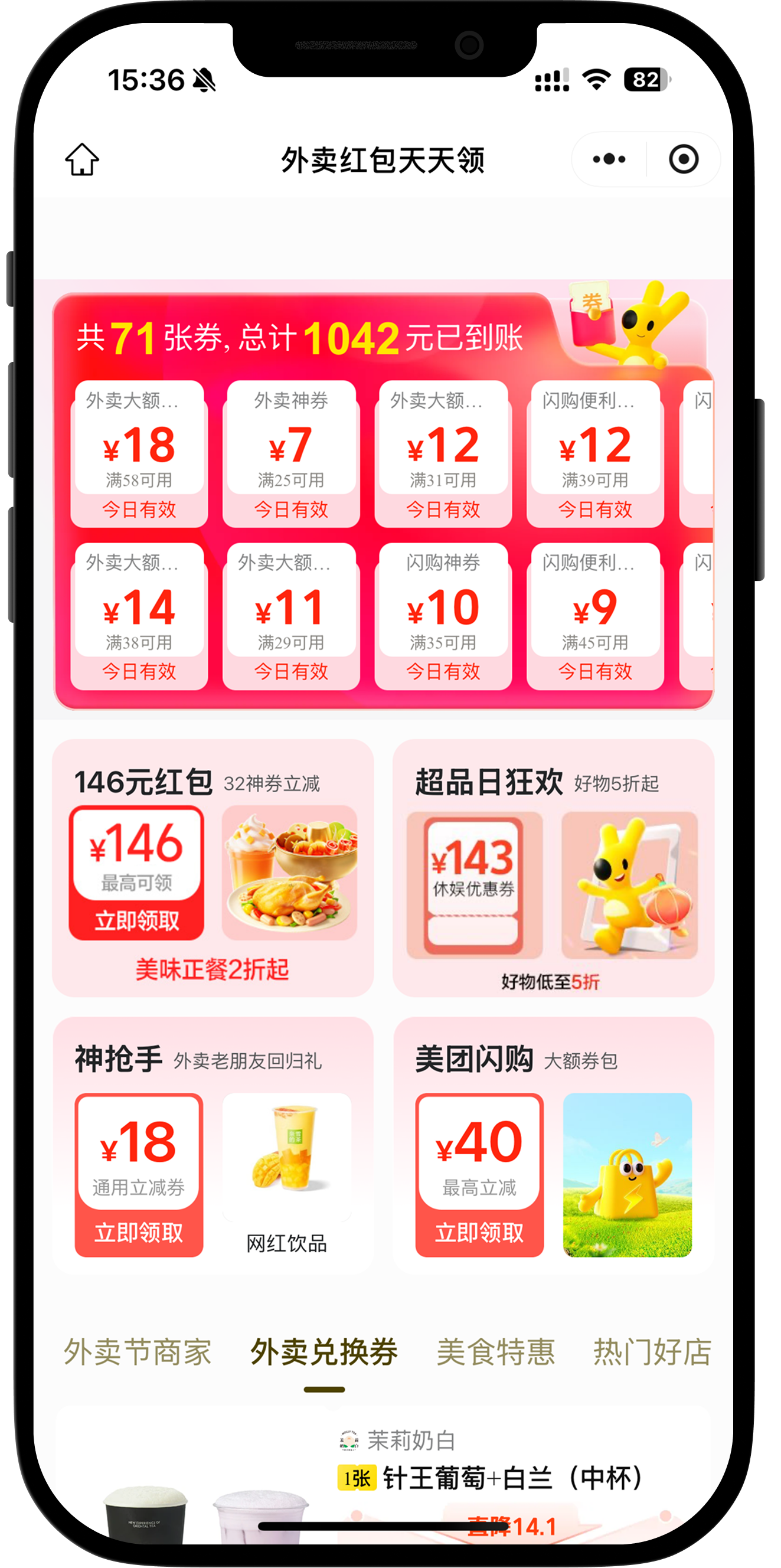 美团:美团外卖天天神券每天可领,有满65减9元等额度。
